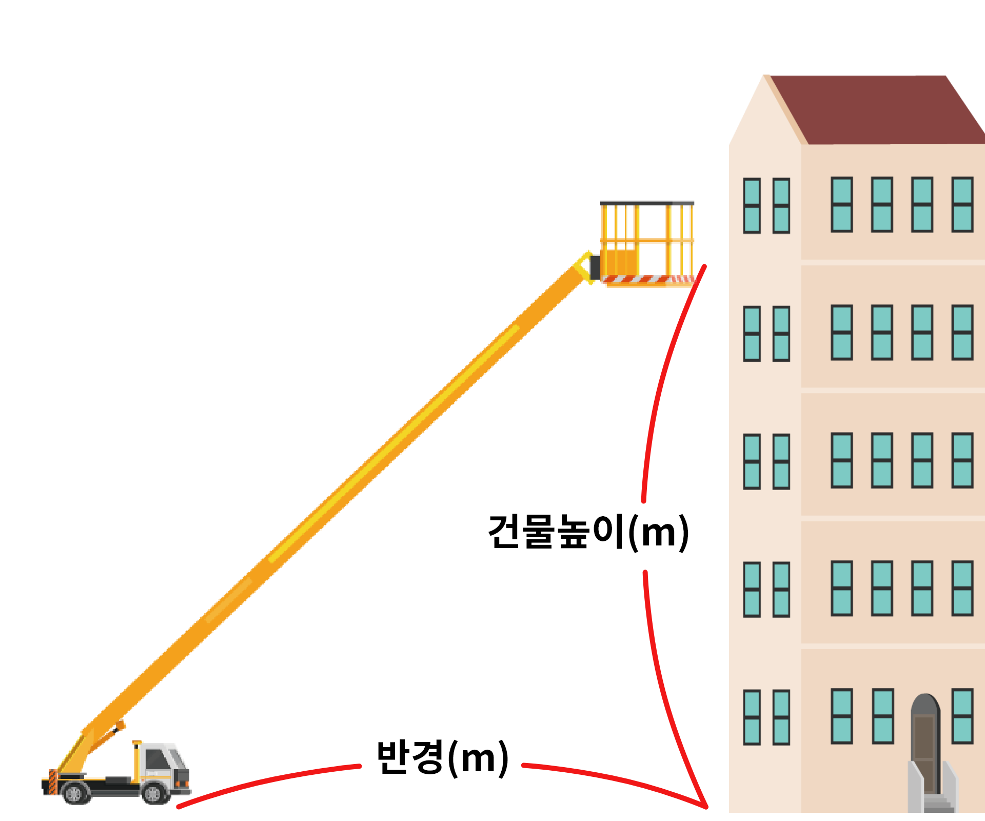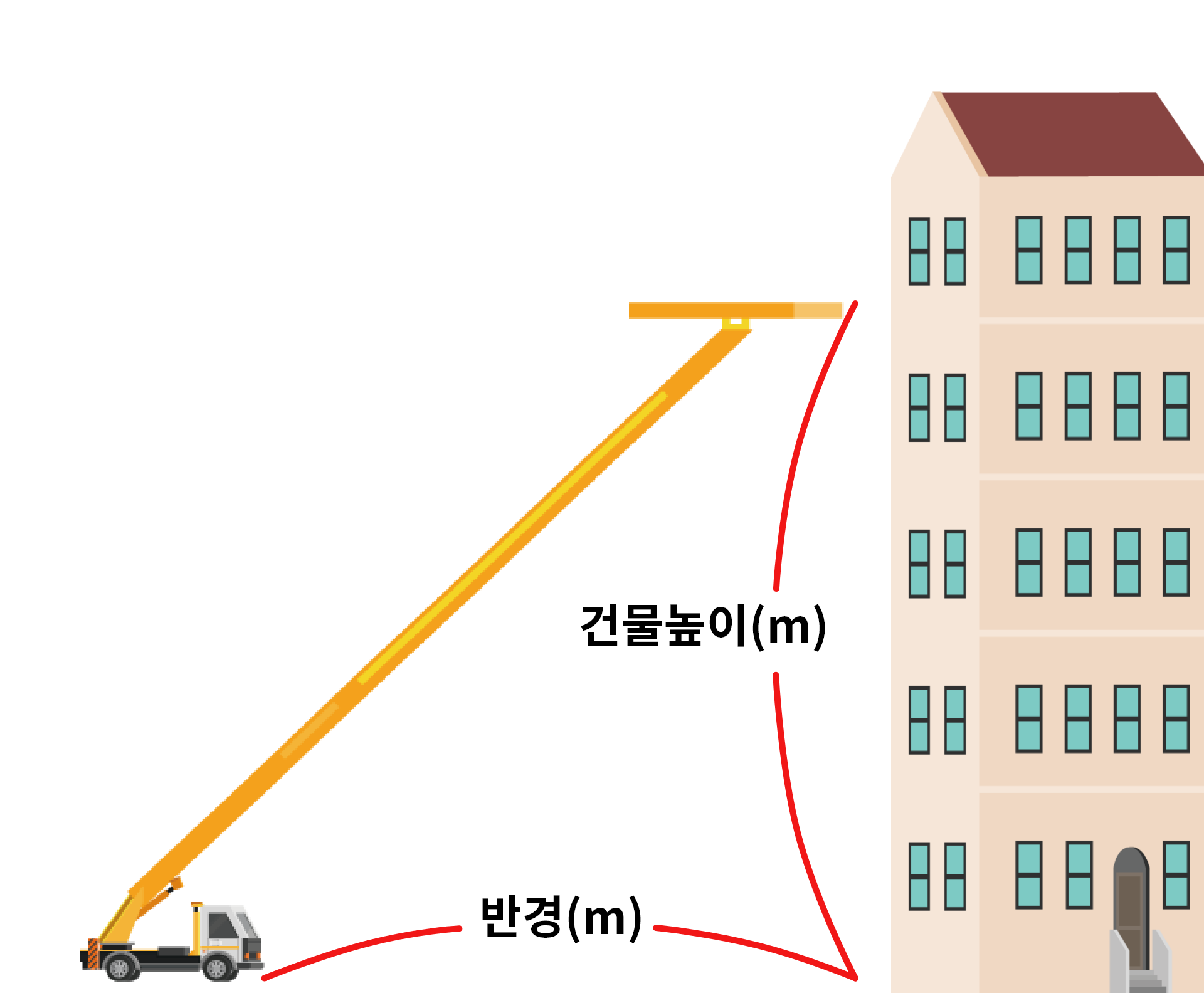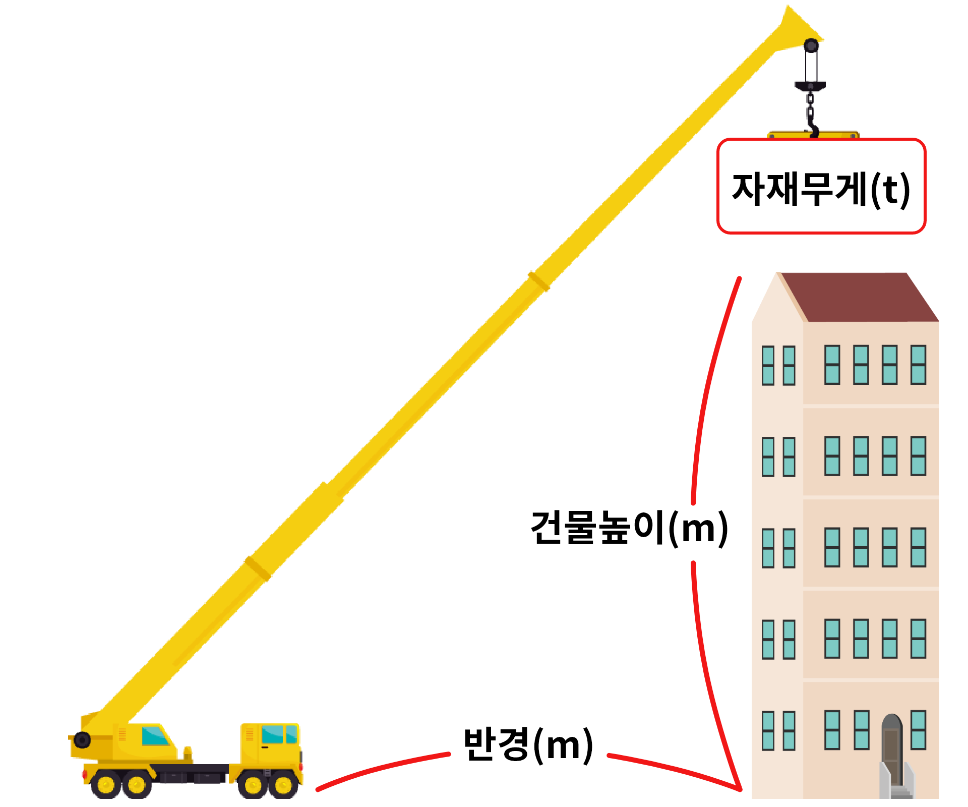 * 작업거리, 건물의높이, 인양할 물건의 무게에 따라 최소 가능한 톤수를 보여줍니다.